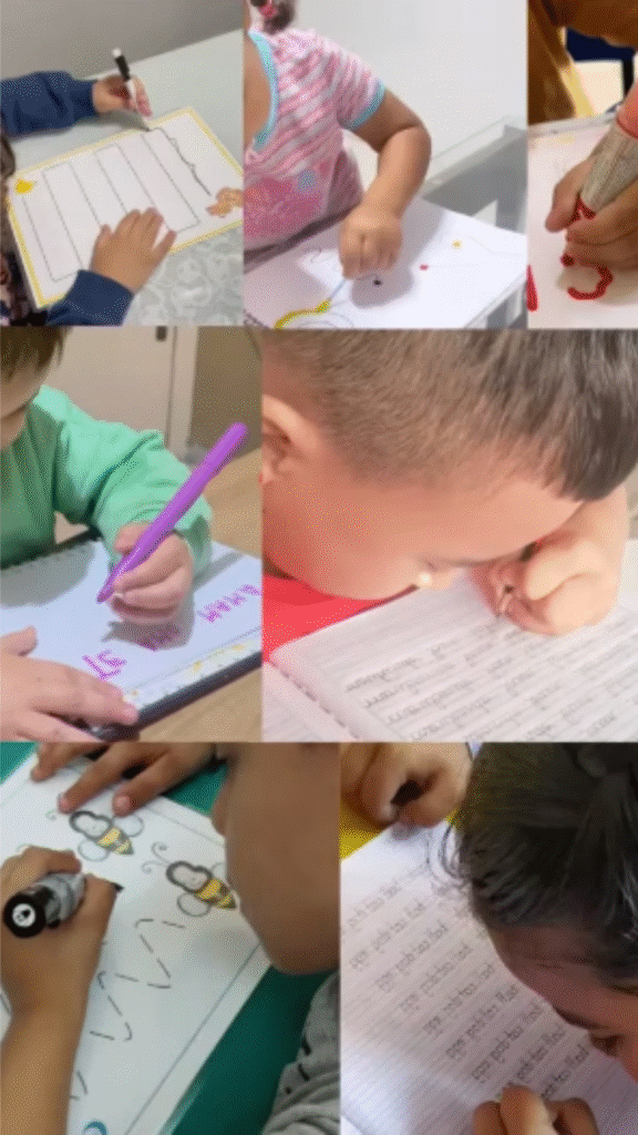 Ao traçar linhas, curvas e padrões fonéticos, ela fortalece as conexões cerebrais responsáveis pela leitura, acelerando o processo de alfabetização de forma divertida e sem pressão.